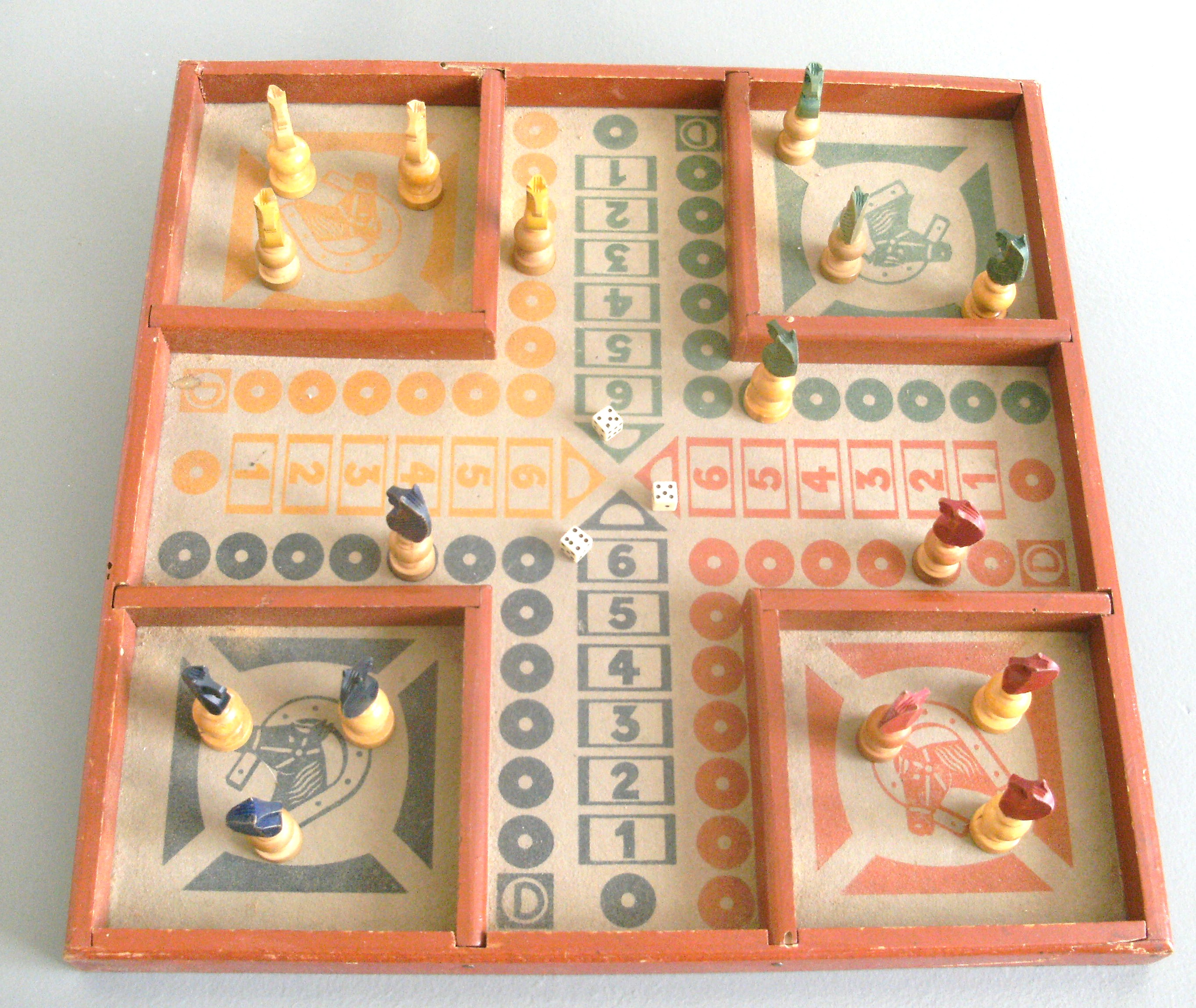 Le jeu des petits chevaux, probablement apparu autour de1936enFrance, est une variante de ces jeux pratiqués auxÉtats-Uniset enEuropeautour des années 1900. Il se différencie par l'utilisation de pions-chevaux et par une règle originale d'arrivée des pions. Il n'existe pas de refuge comme chez ses prédécesseurs.